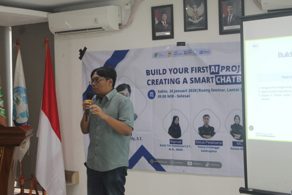 Workshop ini menghadirkan Kevin Fernaldy, S.T. sebagai pemateri yang membagikan pengetahuan serta pengalaman praktis terkait pengembangan proyek AI pemula. Kegiatan diselenggarakan oleh Yosua Crisangga Keidrajatna selaku ketua pelaksana dan turut dihadiri oleh jajaran pimpinan serta pengelola akademik, di antaranya Ketua Program Studi Informatika Ratih Titi Komala Sari, S.T., M.M., M.MSI, Wakil Ketua Program Studi Informatika Rima Tamara Aldisa, S.Kom., M.Kom, Ketua UPM FTKI Ahmad Rifqi, S.Kom., M.MSI, serta Anggota UPM FTKI Mohammad Aldinugroho Abdullah, S.Kom., M.Kom.