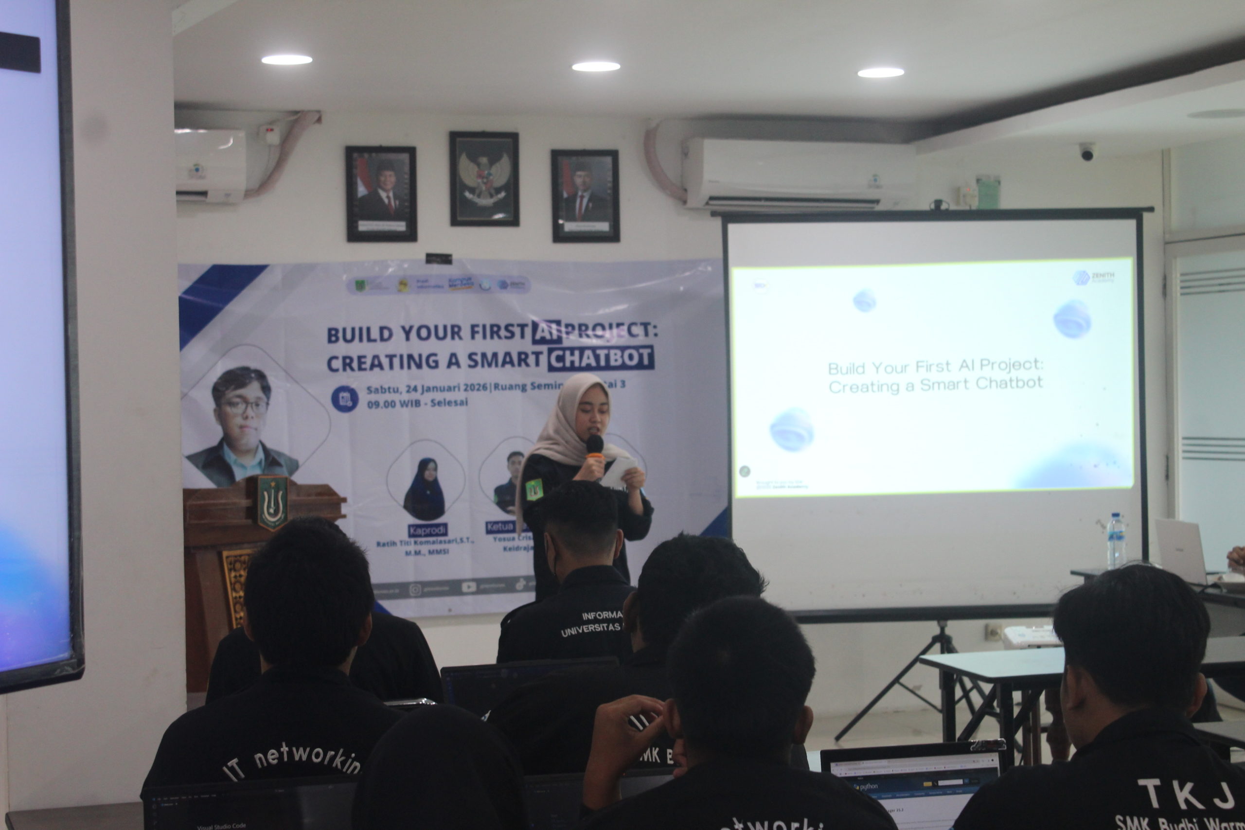 Himpunan Mahasiswa Informatika (HIMTI) FTKI bersama Program Studi Informatika Universitas Nasional kembali menunjukkan komitmennya dalam pengembangan literasi teknologi dengan menggelar workshop bertema “Build Your First AI Project: Creating A Smart Chatbot”. Kegiatan ini menjadi wadah pembelajaran interaktif bagi peserta untuk mengenal dan mempraktikkan secara langsung pembuatan chatbot cerdas berbasis kecerdasan buatan. Workshop dilaksanakan pada Sabtu, 24 Januari 2026, bertempat di Ruang Seminar Lantai 3 Universitas Nasional, mulai pukul 09.00 WIB hingga selesai.