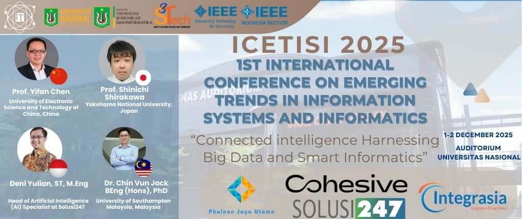 Fakultas Tenologi Komunikasi dan Informatika Universitas Nasional (UNAS) akan menyelenggarakan ICETISI 2025, yaitu 1st International Conference on Emerging Trends in Information Systems and Informatics pada tanggal 1–2 Desember 2025 di Auditorium Universitas Nasional, Jakarta. Konferensi internasional ini mengangkat tema “Connected Intelligence Harnessing Big Data and Smart Informatics” dan bertujuan menjadi wadah ilmiah untuk membahas perkembangan terbaru di bidang sistem informasi, informatika, big data, dan kecerdasan terhubung. Acara ini menghadirkan pembicara terkemuka dari berbagai negara, di antaranya Prof. Yifan Chen dari University of Electronic Science and Technology of China (China), Prof. Shinichi Shirakawa dari Yokohama National University (Jepang), Deni Yulian, ST., M.Eng, selaku Head of Artificial Intelligence (AI) Specialist di Solusi247 (Indonesia), serta Dr. Chin Vun Jack, BEng (Hons), PhD, dari University of Southampton Malaysia (Malaysia). ICETISI 2025 diselenggarakan sebagai upaya meningkatkan kolaborasi antara akademisi, peneliti, industri, dan pemerintah dalam mendorong inovasi berbasis teknologi informasi. Kegiatan ini akan berlangsung melalui rangkaian keynote speech, presentasi riset, diskusi panel, dan sesi networking yang memungkinkan para peserta untuk bertukar ide, mempresentasikan hasil penelitian, serta membangun jejaring kolaborasi. Konferensi ini juga didukung oleh berbagai mitra industri seperti Solusi247, Integrasia, dan Cohesive sebagai bentuk sinergi antara dunia pendidikan dan dunia usaha.