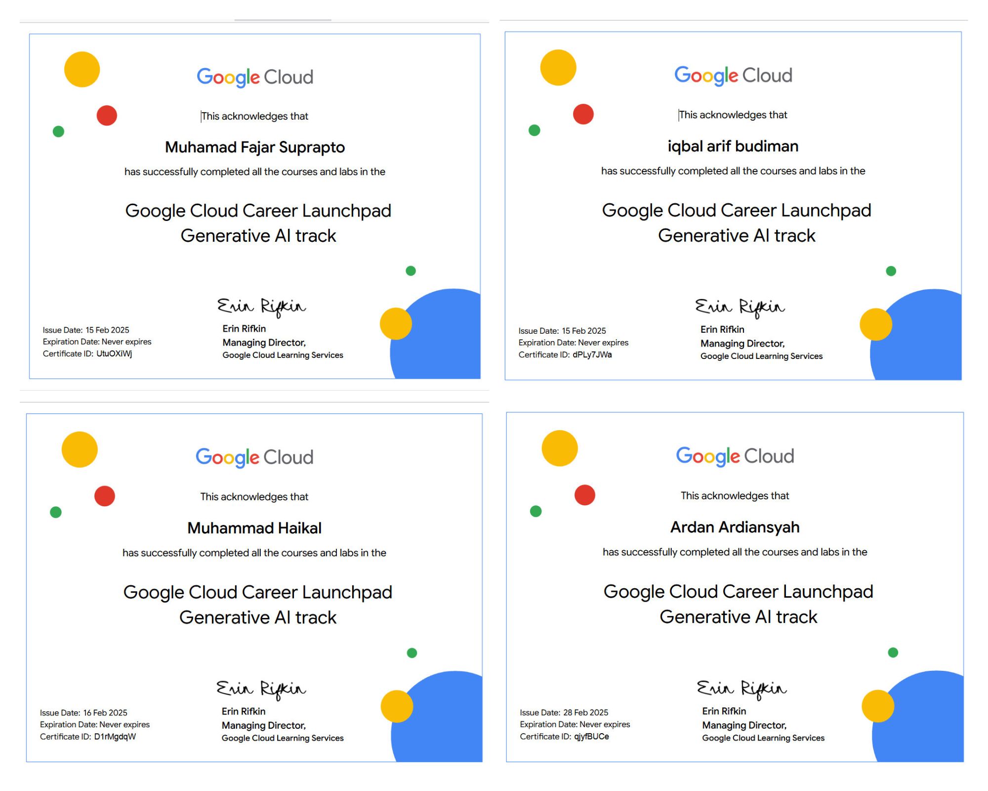 7 College Student FTKI, Has Successfully Completed All The Courses And Labs in Google Cloud Career Launchpad Generative Ai Track Ardan Ardiansyah Muhammad Fajar Suprapto Iqbal Arif Budiman Muhammad Haikal Pancar Hizkia Achmad Maulana Ishakh Azhari Alfath