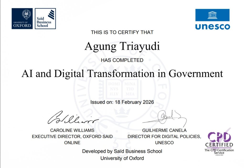 Prof. Agung Triayudi, S.Kom., M.Kom., Ph.D berhasil menyelesaikan program AI and Digital Transformation in Government yang dikembangkan oleh Saïd Business School, University of Oxford, bekerja sama dengan UNESCO. Sertifikat kelulusan tersebut diterbitkan pada 18 Februari 2026 sebagai bukti partisipasi dan penyelesaian program pembelajaran yang membahas penerapan kecerdasan buatan serta transformasi digital dalam sektor pemerintahan.