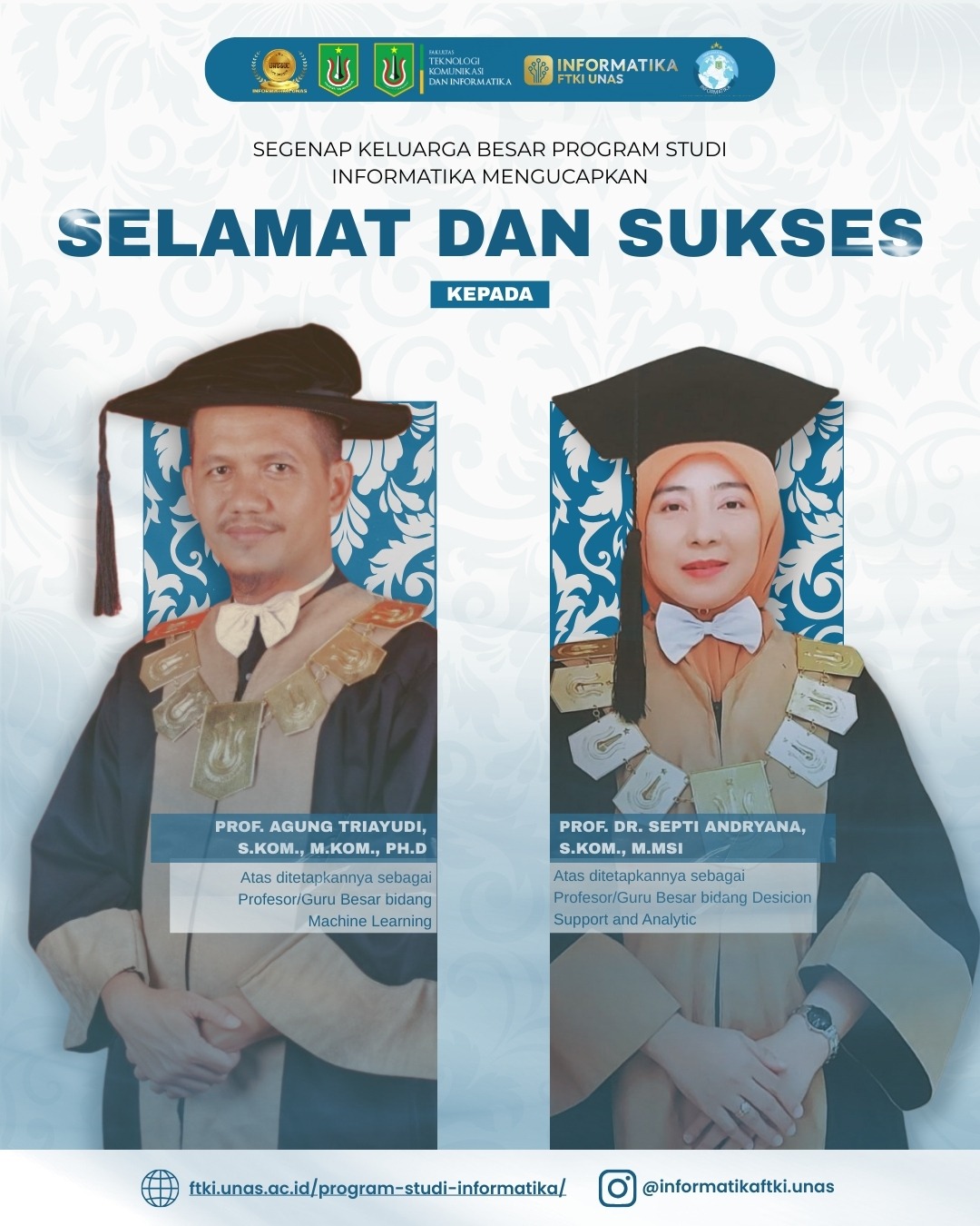 Program Studi Informatika, Fakultas Teknologi Komunikasi dan Informatika (FTKI) Universitas Nasional (UNAS) menyampaikan ucapan selamat dan sukses kepada Prof. Agung Triayudi, S.Kom., M.Kom., Ph.D. yang telah ditetapkan sebagai Profesor/Guru Besar bidang Machine Learning, serta Prof. Dr. Septi Andryana, S.Kom., MMSI yang telah ditetapkan sebagai Profesor/Guru Besar bidang Decision Support and Analytic.