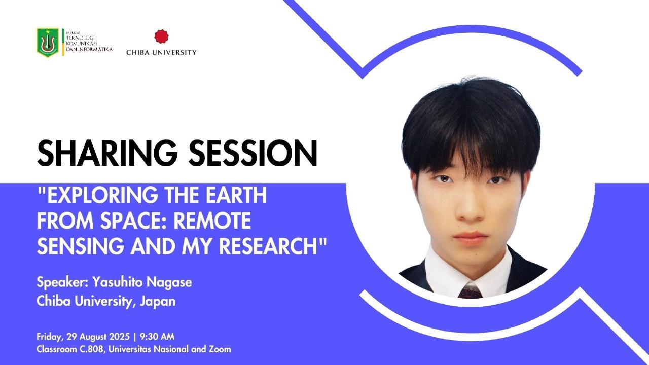 Jakarta, 24 Oktober 2025, Program Pascasarjana Teknologi Informasi Universitas Nasional menyelenggarakan kegiatan Sharing Session bertajuk “Exploring the Earth from Space: Remote Sensing and My Research” pada Jum’at, 29 Agustus 2025, bertempat di Ruang Kelas C.808 serta dilaksanakan secara hybrid (luring dan daring).