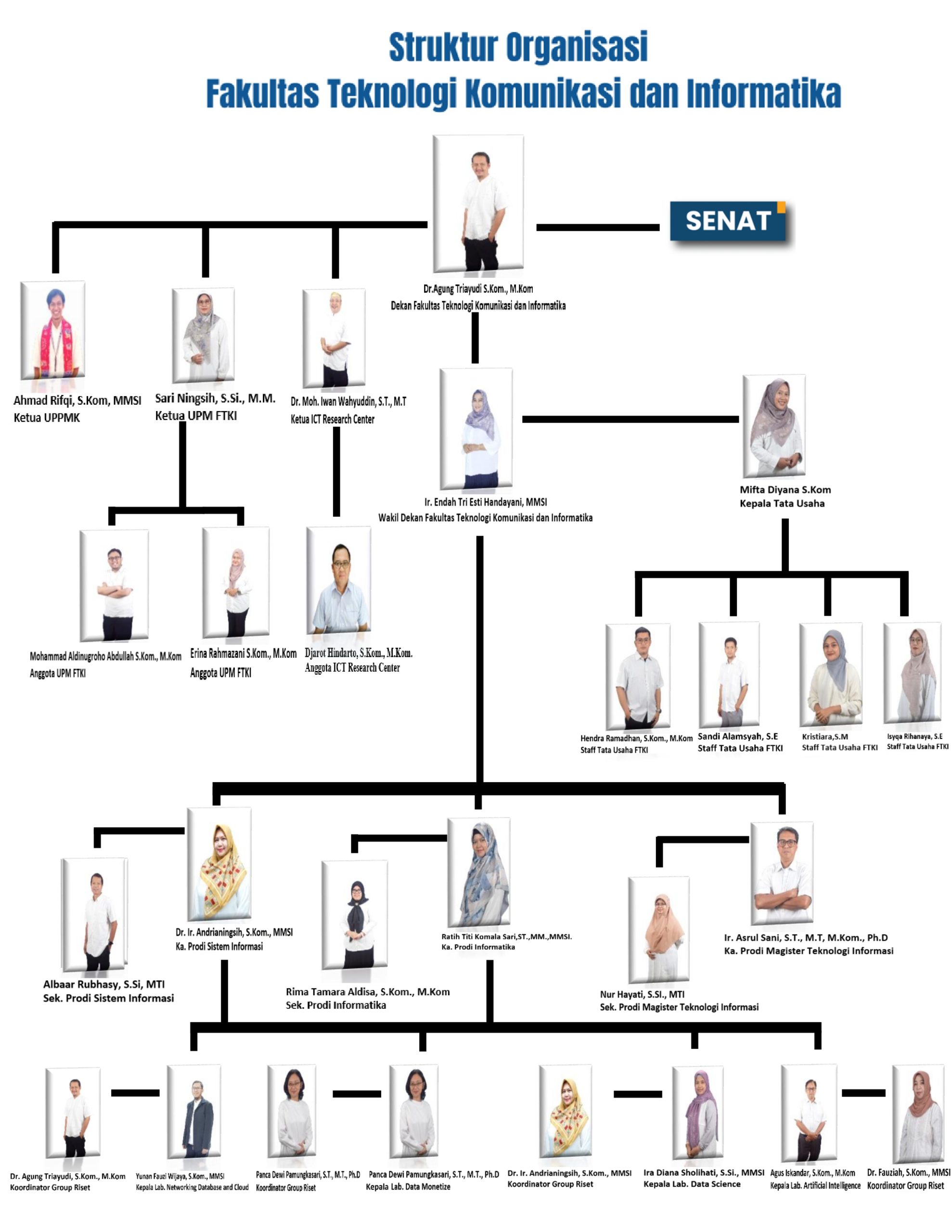 | Dr. Mohammad Iwan Wahyuddin, S.T, M.T | Ketua ICT Reserch Center | Mengelola dan mengembangkan pusat informasi yang berkaitan dengan berbagai kegiatan akademik dan non-akademik di fakultas. Tugas utama mereka meliputi koordinasi dan supervisi terhadap kegiatan penelitian yang dilakukan oleh dosen dan mahasiswa, termasuk memfasilitasi penyusunan proposal penelitian, pelaksanaan penelitian, dan publikasi hasil penelitian. Selain itu mengorganisir dan mengelola kegiatan seminar, workshop, dan konferensi yang bertujuan untuk meningkatkan pengetahuan dan keterampilan dosen serta mahasiswa di bidang teknologi informasi dan komunikasi |